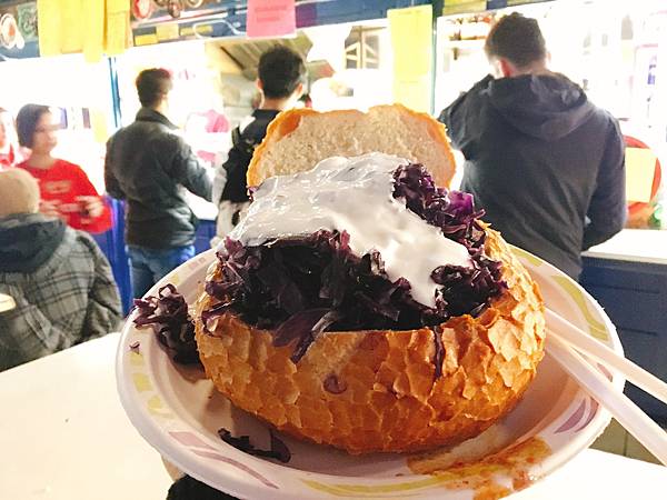 Anyways 餓到昏了沒有力氣再去別的地方找食物,最後選了這個 "麵包容器Goulash+醃紫菜酸奶"