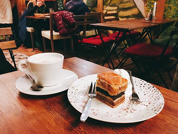 甜點的名字叫做Flódni,是個多層次的孩子,由上到下分別是派皮、蘋果、派皮、榛果、派皮、李子果醬、派皮、罌粟籽、派皮